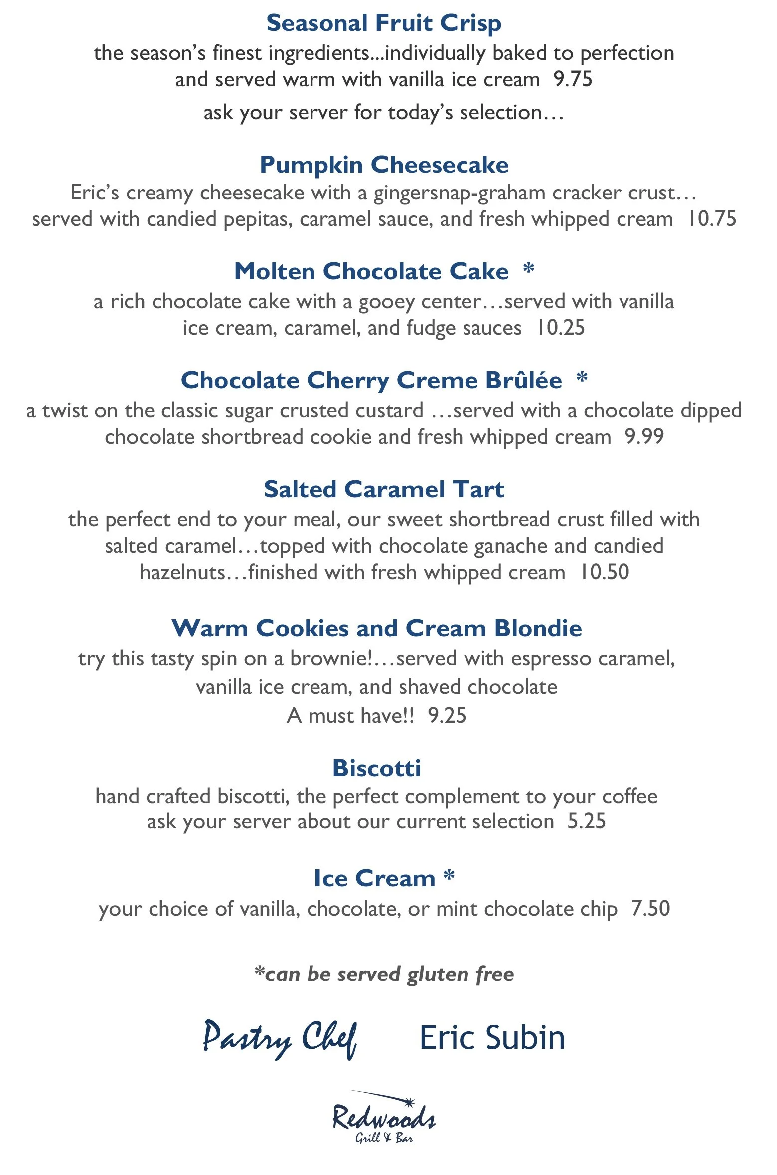 Redwoods Dessert Menu